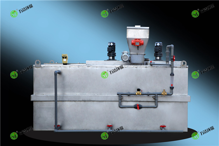 PAM加藥裝置的制備過(guò)程通過(guò)三級(jí)溶液箱逐級(jí)完成,溶液箱之間用擋板隔開(kāi),以保證每個(gè)溶液箱內(nèi)的反應(yīng)時(shí)間和恒定的濃度,避免產(chǎn)生溶解短路。干粉螺旋輸送機(jī)可以定量輸送粉劑保證制備濃度。